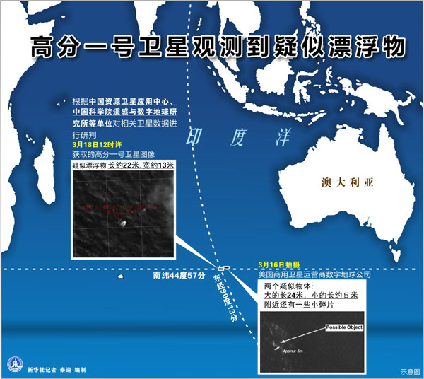 圖表:高分一號衛星在南印度洋海域觀測到疑似漂浮物 新華社記者 秦迎 編制 3月18日12時許獲取的高分一號衛星圖像中,南印度洋海域(南緯44度57分,東經90度13分),觀測到疑似漂浮物。