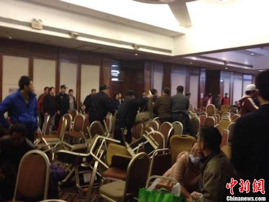 中新網北京3月24日電 (王曦 曾鼐)聽聞馬方宣布馬航MH370航班墜入印度洋的消息后,在北京麗都飯店的乘客家屬悲痛欲絕。記者在現場看到,有數名女家屬暈倒,醫護人員在現場搶救。不少男家屬也痛哭失聲。