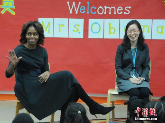 當地時間3月4日,將于3月下旬訪華的美國第一夫人米歇爾·奧巴馬走進華盛頓育英學校的中文課堂,為第一次中國之行做準備。課堂上,米歇爾學說中國話,還透露自己愿意品嘗從沒吃過的特色中國菜。中新社發 德永健 攝