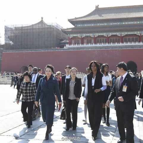 【彭麗媛和米歇爾一起參觀故宮】21日,彭麗媛和米歇爾一起參觀故宮。故宮博物院院長單霽翔介紹說,故宮在北京的中軸線上。在美國華盛頓,國會(huì)山到林肯紀(jì)念堂也在一條中軸線上,這說明中美在建筑和城市規(guī)劃上也有相通之處。
