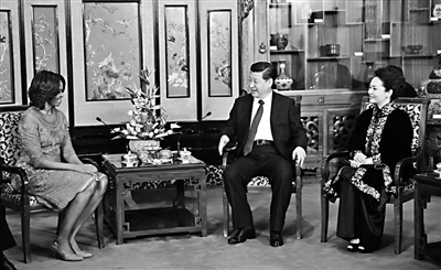 彭麗媛對米歇爾說,相信今天的參觀有助于增加你們對中國教育的了解,瑪麗亞和薩莎也結識了中國小伙伴。習近平歡迎米歇爾女士偕母親羅賓遜夫人和女兒訪華,請她轉達對奧巴馬總統的親切問候和良好祝愿。