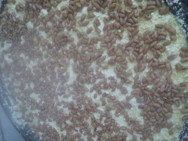 媽媽用自己種的飯豆子,現把豆子放鍋里煮7分熟,然后撈出來,把豆子鋪在蒸簾上,然后把粘米粉一把一把灑在豆子上,灑5寸厚,邊灑邊燒火,蒸氣上勻稱蓋上鍋蓋,燒半小時火,起鍋就好了。媽媽做的粘糕,每年過年必吃,粘上白糖,非常好吃。