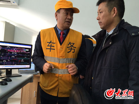 即墨北站行車室里,牟叢峰正在向駐站值班員了解工作情況。