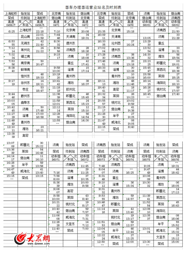 (一)直通列車:榮成~上海虹橋G458/5 G456/7次高速動車組列車1對。煙臺南~北京南G472/G471次高速動車組列車1對。榮成~北京南G476/G475次高速動車組列車1對。