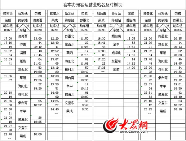 D6091次由即墨北自2014年12月28日起開行。D6002次由青島、D6075次由濟南、D6096次由榮成、D6095次由即墨北、D6092次由榮成、D6076次由榮成、D6017次由濟南均自2014年12月29日起開行。D6094次由榮成、D6093次由煙臺南均2014年12月29日至2015年2月3日開行。D6094次由榮成、D6093次由煙臺南均自2015年2月4日起停運。榮成~煙臺南D6094/D6093次改為煙臺始發、終到開行日期另行通知。