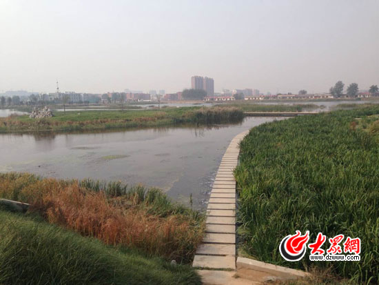 為了修復生態(tài),夏津縣規(guī)劃保護和擴建了九龍口濕地位。九龍口濕地于夏津縣污水處理廠西側,占地約1638畝,總投資6000萬元,2013年9月19日開工建設,當年11月30日竣工。九龍口人工濕地大體劃分為河道區(qū)、湖面區(qū)。河道較狹長,種植蘆葦?shù)戎参铩TO計規(guī)模日處理污水5萬立方米,采用 “潛流+表流+河道走廊”處理工藝。整個潛流濕地采用重力流布水方式,縣污水處理廠出水經(jīng)潛流濕地凈化后,由汀步跌水堰流至表流濕地,經(jīng)過濕地處理后的水質(zhì)達到地表水V類水質(zhì)標準,可用于景觀用水和城市雜用,具有生態(tài)調(diào)節(jié)、改善水質(zhì)、涵養(yǎng)水源和風景觀賞等功能,年可削減COD150噸、氨氮15噸。