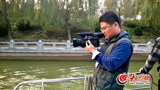 10月27日下午,聚焦“一圈一帶”第十屆中國網絡媒體山東行采訪團記者登船采訪聊城東昌湖和運河水系。記者 馬俊驥 攝