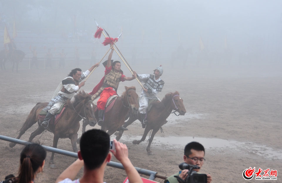 18日上午,“聚焦美麗山東——第九屆中國網(wǎng)絡(luò)媒體山東行”南線采訪團(tuán)來到臨沂沂水縣天上王城,這座依托世界罕見的山崮地貌群而建,以商周時(shí)期紀(jì)國遷都等歷史故事為主題的古城,把歷史文化、自然景觀與休閑旅游結(jié)合起來,讓游客們盡覽山崮獨(dú)特景觀的同時(shí),領(lǐng)略齊魯千古文明。圖為:紀(jì)王崮大型馬戰(zhàn)表演中,“紀(jì)王”與“齊王”激戰(zhàn)。大眾網(wǎng)記者 熊戈措 攝