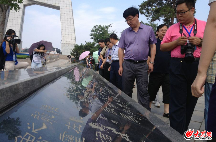 19日,南線媒體采訪團來到臨沂書法廣場,記者們仔細欣賞王羲之留下的臥碑書法。(大眾網記者 李兆輝攝)