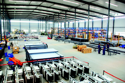 <山東蘭劍物流科技有限公司投資6億元,在臨邑縣東部高新區(qū)規(guī)劃建設的集物流裝備研發(fā)制造、物流軟件開發(fā)、物流信息服務于一體的物流裝備與技術產(chǎn)業(yè)基地。圖為正在組裝的煙草分揀車間。