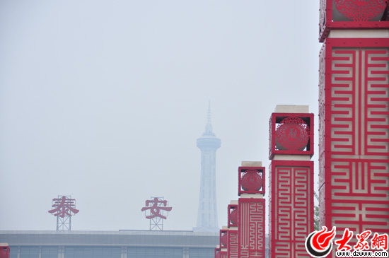 泰安高鐵站霧中看上去古樸與現代并存。大眾網記者 熊戈措 攝