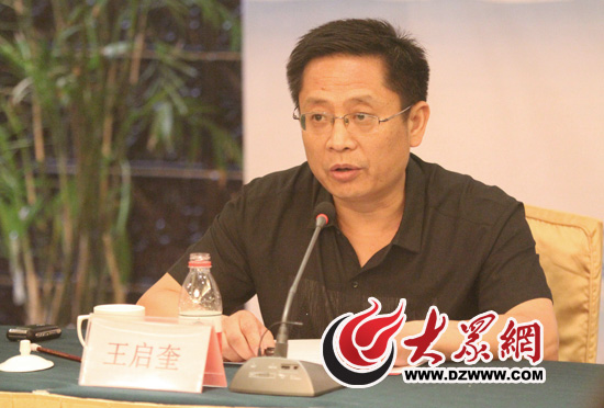 臺(tái)兒莊區(qū)區(qū)委書(shū)記、臺(tái)兒莊古城管委會(huì)主任王廣金介紹了臺(tái)兒莊區(qū)的相關(guān)情況。大眾網(wǎng)記者 赫洋 攝