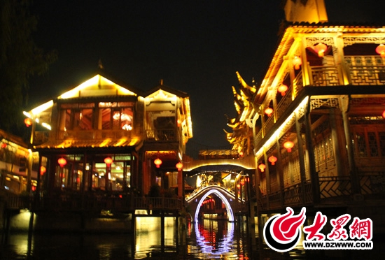 白天的臺兒莊古城清美寧靜,青石板路,亭臺樓閣,清水在路邊盈盈流淌,游人在這里放下心事盡情賞景。古城似有南方小鎮的婉轉清秀,又流露出北方水土的豪邁風情。采訪團的記者們來到此地后倍感驚訝:“北方竟也有這般富含風韻的古城?”