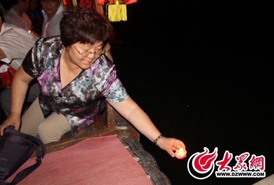 采訪團的一位成員將點燃的蠟燭放到水面上。 記者 郭豪攝