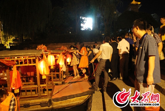 今天晚上,西線采訪團(tuán)來到臺(tái)兒莊古城,準(zhǔn)備登船夜游。 記者 郭豪攝