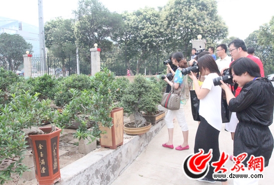 石榴盆景是嶧城石榴園重要的深加工產(chǎn)業(yè)之一,采訪團(tuán)的記者們正拍攝石榴盆景。