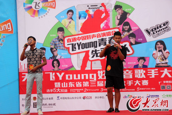 大眾網煙臺6月15日訊(記者 趙潔)6月15日,天翼飛young好聲音歌手大賽暨山東省第三屆網絡歌手大賽煙臺&威海站開賽,煙臺新世界百貨廣場上激情萬分,2013年飛young校園好聲音冠軍徐亞飛和中國好聲音明星學院單沖鋒的激情獻唱,引來眾多駐足。