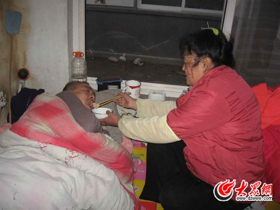 隔壁的戴大娘豎起大拇指說:“屎拉到褲子上,經常看他洗。朱典臣也真是沒挑的,為人老實,不抽煙,不喝酒,脾氣又好,這么多年了,早晨和夜晚幾乎都是典臣照顧鄒興福的飲食起居,他從來不嫌臟嫌累,俺周圍的人都敬佩他。”