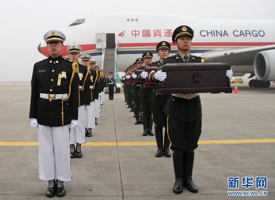 根據(jù)中韓雙方達(dá)成的共識,經(jīng)過相關(guān)部門共同努力,當(dāng)?shù)貢r(shí)間3月28日上午7時(shí)30分,中韓雙方在韓國仁川國際機(jī)場,舉行在韓中國人民志愿軍烈士遺骸交接儀式。中方交接在韓志愿軍烈士遺骸代表團(tuán)團(tuán)長、民政部優(yōu)撫安置局局長鄒銘與韓方代表、韓國防部軍備控制次長文尚均準(zhǔn)將現(xiàn)場簽署了交接書,確認(rèn)交接437具志愿軍烈士遺骸以及相關(guān)遺物。隨后,中方為烈士遺骸覆蓋國旗,并舉行了簡短祭奠儀式,烈士遺骸由中方禮兵護(hù)送登上運(yùn)送遺骸專機(jī)。專機(jī)將于28日上午飛抵沈陽,祖國和人民將以莊嚴(yán)的禮儀迎接烈士英靈回家。
