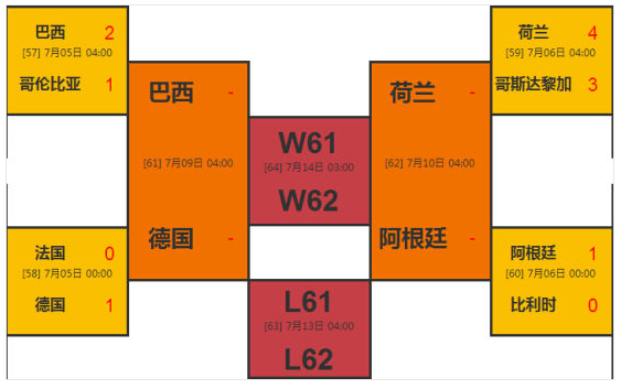 北京時(shí)間7月9日周三凌晨04:00,半決賽第一場(chǎng)巴西vs德國(guó);7月10日周四凌晨04:00,半決賽第二場(chǎng)荷蘭vs阿根廷。