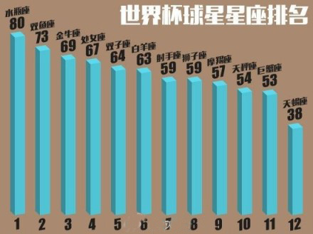 媒體對(duì)所有736名參加世界杯球員的統(tǒng)計(jì)后發(fā)現(xiàn),在本屆世界杯的參賽球員中,水瓶座貢獻(xiàn)了80名球員,占全部參賽球員的10.8%。C羅,內(nèi)馬爾,羅本都是世界級(jí)的前場(chǎng)殺手,而水瓶座的后場(chǎng)則由皮克,布馮壓陣。貢獻(xiàn)最少的星座則是天蝎座,神秘的蝎子只貢獻(xiàn)了5%的球員,德國(guó)隊(duì)長(zhǎng)拉姆和英格蘭隊(duì)的魯尼是這個(gè)神秘星座的代表球星。
