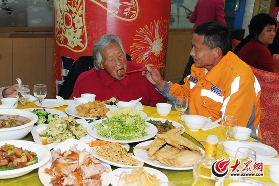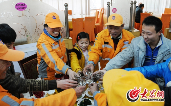 今天中午,來自歷下區(qū)城管局的13個(gè)環(huán)衛(wèi)工家庭,在濟(jì)南軍區(qū)第二招待所吃了一頓豐盛的團(tuán)圓飯。