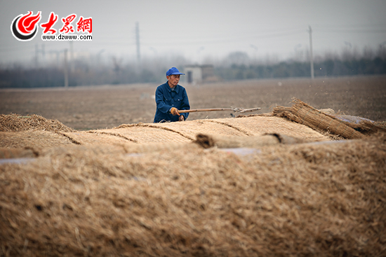 一位韭農給韭菜棚蓋保溫草席。楊春衛 攝