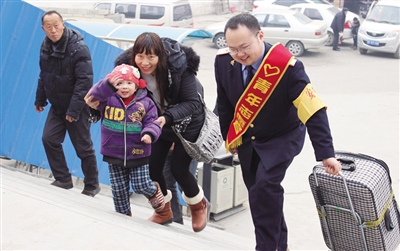青年志愿者們還根據(jù)當?shù)厝讼矚g按農(nóng)歷說日期的習慣,專門制作了《春運40天農(nóng)歷和公歷對照表》,張貼在所有售票窗口,并制作互聯(lián)網(wǎng)購票(電話訂票)流程操作卡、春運車次時刻表等便攜式宣傳資料,免費分發(fā)給過往旅客。圖為青年志愿者正在主動幫扶重點旅客進站。