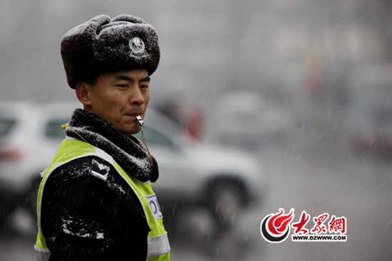 王曰磊雪天執勤,衣帽上落滿了雪花(交警供圖)