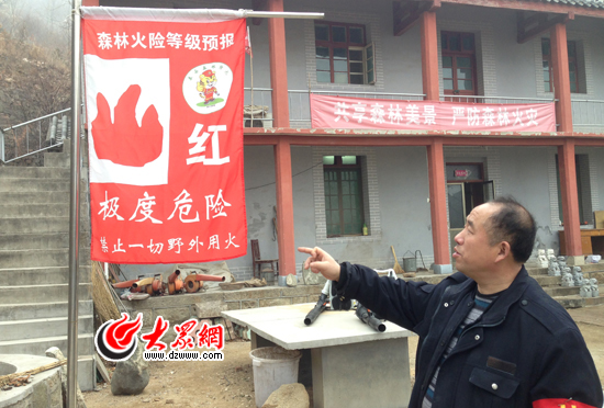 1月31日,沿著崎嶇的山路,大眾網記者來到實驗林場。沿途上到處可見“嚴禁野外用火”等森林防火的標語,在重要路口也懸掛著紅色森林火險等級的標志。張興告訴大眾網記者,從1月29日開始,實驗林場的火險等級就提升到了紅色。