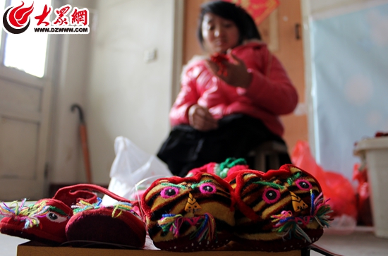 12月11日上午,記者見到韋慶蘭時,她正在租賃的房子里,坐在板凳上繡虎頭鞋,一針一線間透露著嫻熟。這姑娘雙手纖長卻略顯粗糙,多個老繭不規(guī)律的“安家”在她的手掌上,雙手已經(jīng)凍得通紅,但干起活來卻靈巧自如。她身上的紅色棉襖有些舊,袖口多處已經(jīng)磨掉了色。
