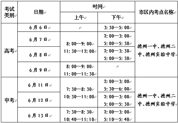 大眾網德州6月6日訊(記者 趙乾)2013年普通高校招生考試(夏季)于6月7日至9日進行,初中學業水平考試(以下簡稱中考)于6月11日至13日進行。為給考生創造良好的考試環境,德州市公安局交警支隊將在考試期間,對通往各考點的主要道路實行交通管制,確?忌徒铀捅O考員、運送試題試卷的車輛順利進出考點。運送考生的車輛憑考生的“準考證”進入被管制路段;接送涉考人員和運送試題的車輛,憑招生考試機構統一制作的車牌進入被管制路段。市區內管制路段和時間安排見下表: