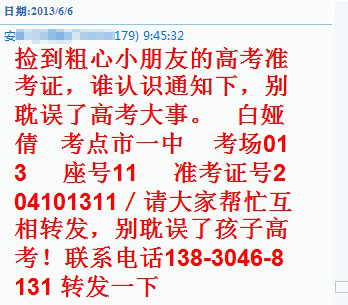 大眾網濟寧6月6日訊(見習記者 韓冉冉)臨近高考,騙子又出新花招。近日來,一條高考生丟了準考證的消息在QQ群中獲得多次轉發:“撿到粗心小朋友的高考準考證,誰認識通知下,別耽誤了高考大事。白婭倩,考點市一中,考場013,座號11,準考證號204101311,請大家幫忙互相轉發,別耽誤了孩子高考!聯系電話138-3046-8131,轉發一下!庇浾咴诰W上查詢后發現,該號碼歸屬地為甘肅慶陽,記者撥打該電話后,發現為關機狀態。