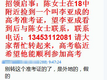 記者在百度搜索相關關鍵詞發現,許多地區都曾出現該同樣內容的QQ消息,由于高考臨近,這條消息在未經證實的情況下,被多次轉發。6日上午一上班,記者QQ所在的六七個群都轉發了該消息。類似消息有:“招領啟事:陳女士在18中附近撿到一個叫李亞成的高考準考證,望李亞成看到后與陳女士聯系,聯系電話:13453112081,請大家幫忙轉起來,高考臨近希望他能順利參加高考!苯洸樵儼l現,該號碼屬地為山西太原。雖然獲得大量轉發,不過也有少部分人對此消息存在質疑,在群中號召群友要擦亮眼睛。
