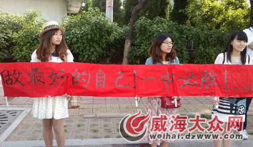 早上7點(diǎn)半,記者來(lái)到威海一中(東校區(qū))考點(diǎn),有三位女生手拉著寫有“做最好的自己,一中必勝”的橫幅,站在考點(diǎn)外。