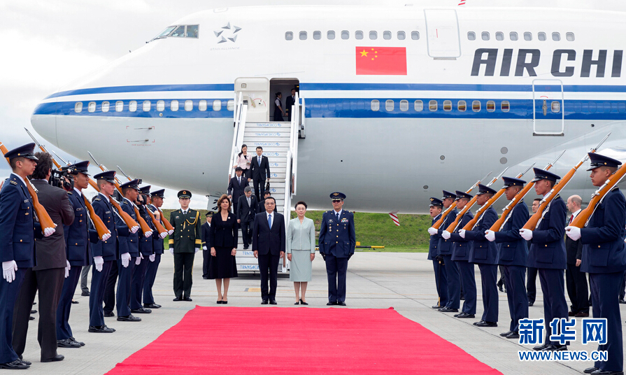 5月21日,國務院總理李克強乘專機抵達哥倫比亞首都波哥大卡塔姆空軍基地,開始對哥倫比亞進行正式訪問。李克強總理夫人程虹同機抵達。哥倫比亞外交部長奧爾古因到機場迎接。新華社記者 黃敬文 攝