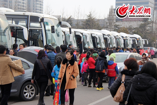 四十多輛大巴車在市政府廣場集合出發(fā)