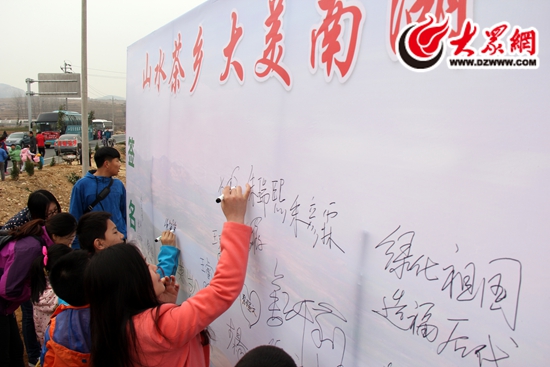 參與活動的網(wǎng)友在“山水茶鄉(xiāng),大美南湖”的簽名板上簽名