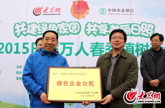 到達(dá)植樹活動現(xiàn)場后,活動首先舉辦了啟動儀式。在啟動儀式上,中國農(nóng)業(yè)銀行日照分行被授予“綠色企業(yè)公民”稱號。