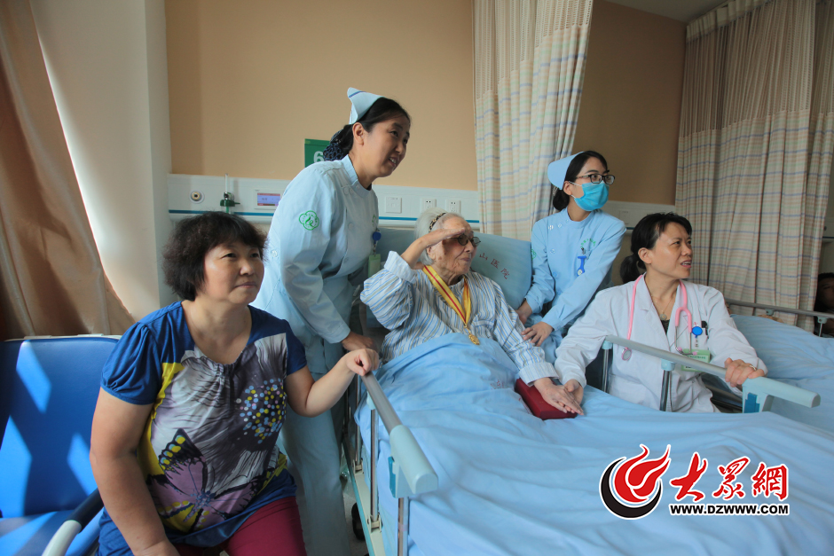9月3日上午10點(diǎn),在千佛山醫(yī)院的一間普通病房里,98歲的抗戰(zhàn)老兵劉芬老人面色紅潤(rùn),正與值班醫(yī)護(hù)人員共同觀看抗戰(zhàn)勝利70周年大閱兵現(xiàn)場(chǎng)直播。在觀看直播時(shí),老人難掩內(nèi)心激動(dòng)心情,莊嚴(yán)的敬了一個(gè)軍禮。大眾網(wǎng)記者 王長(zhǎng)坤 攝