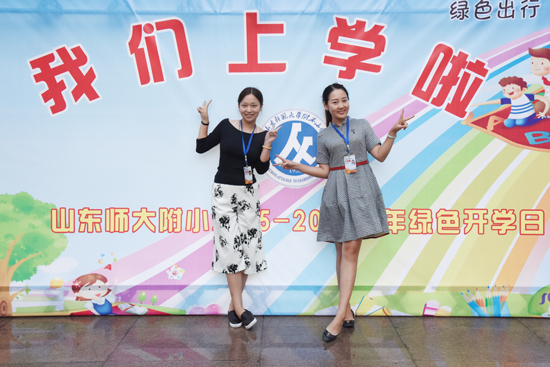山東師大附小宣傳交流處干事王琳琳(左)和徐靜(右)為大閱兵點贊