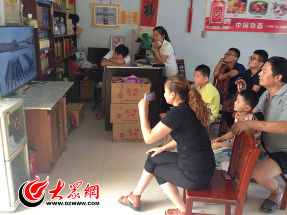 李玉晨的家人在餐館里一同觀看大閱兵