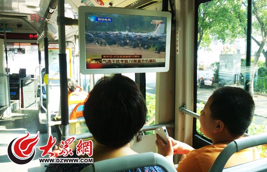 濟(jì)南66路公交車上,市民通過車載電視觀看閱兵式