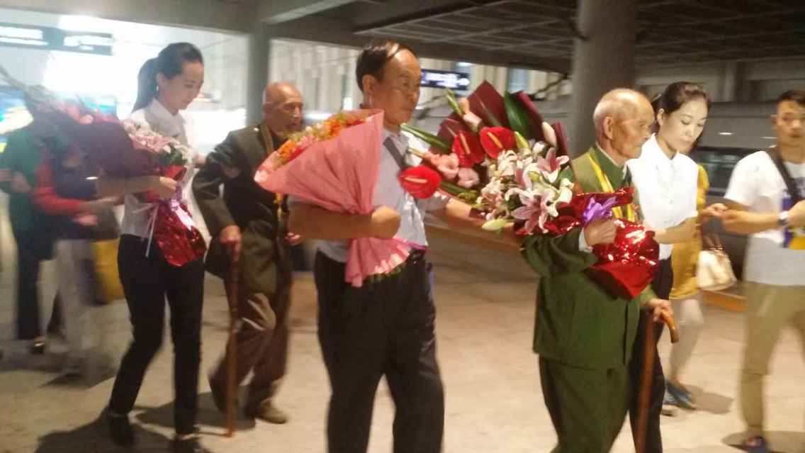 去北京參加紀念抗戰勝利70周年閱兵觀禮的抗戰老兵及英烈子女返回濟南受到熱烈歡迎