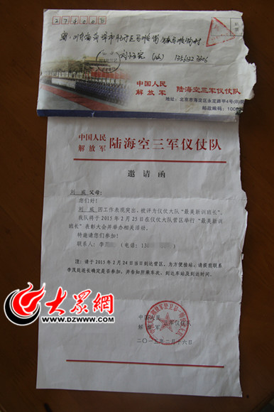 今年9月3日,23歲的菏澤小伙劉威將作為中國(guó)人民解放軍三軍儀仗隊(duì)的一員,亮相抗戰(zhàn)勝利70周年閱兵式。今天,大眾網(wǎng)記者來(lái)到牡丹區(qū)馬嶺崗鎮(zhèn)馬嶺崗行政村,獨(dú)家專訪了劉威的家人了解到,盡管目前每天訓(xùn)練10多個(gè)小時(shí),但有著五年儀仗隊(duì)參軍經(jīng)驗(yàn)的劉威狀態(tài)一直很好。因?yàn)閯⑼募胰擞X(jué)得自身與“國(guó)家大事”聯(lián)系得更加緊密,一家人都感到無(wú)比自豪。