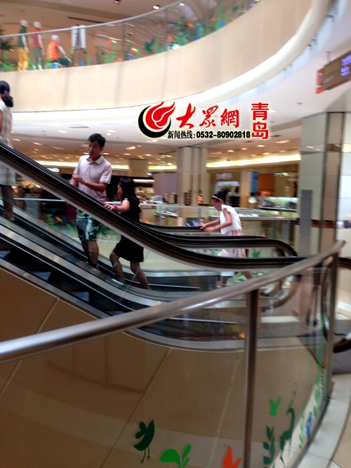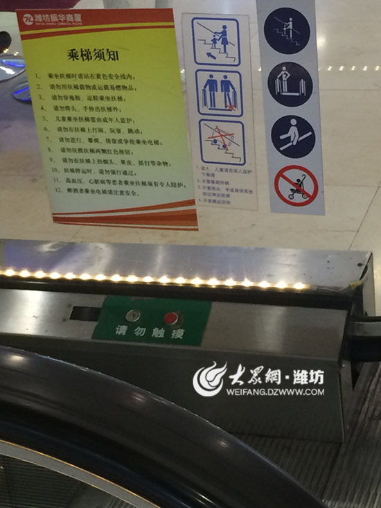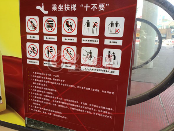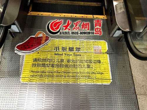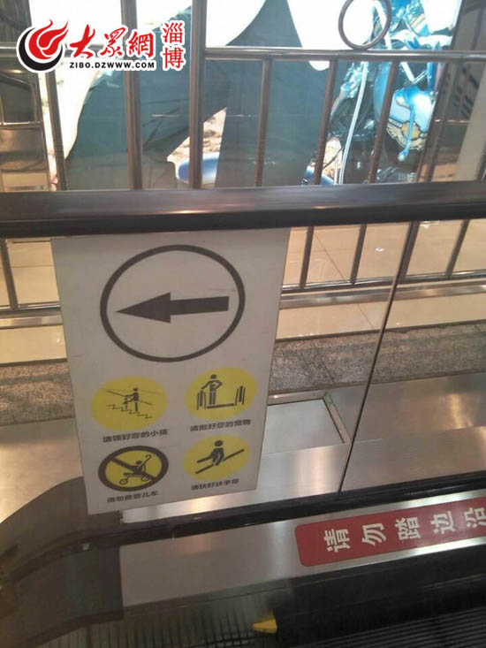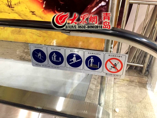 青島萬達(dá)CBD店扶梯的提醒標(biāo)志。
