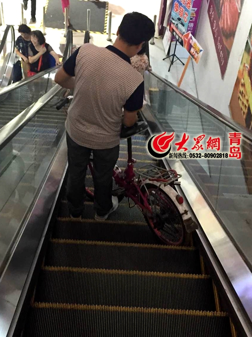 青島萬達(dá)CBD店:顧客抬自行車下扶梯