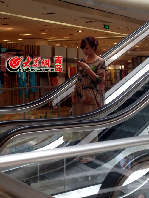 28日上午,顧客在德州百貨大樓電梯上背靠扶手低頭看手機