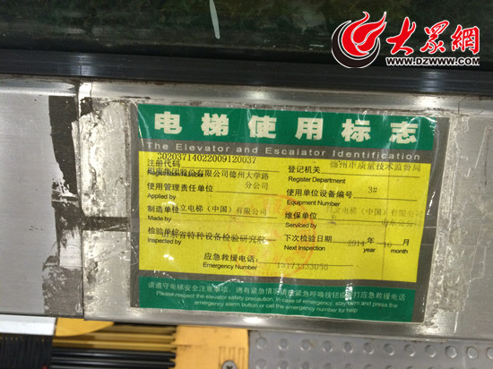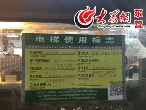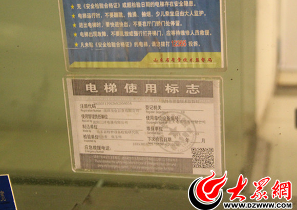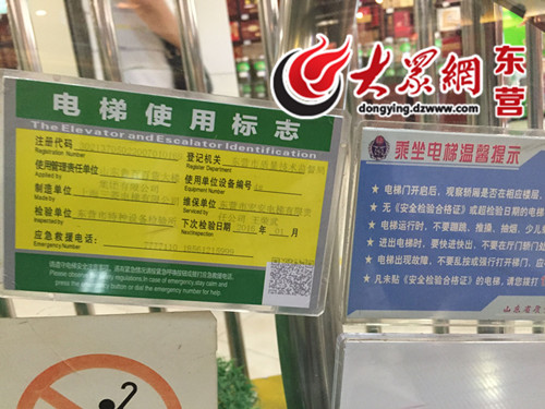 濟南恒隆購物廣場一條從一樓直通三樓扶梯的入口處擺放了兩個電梯使用標(biāo)志,明確標(biāo)明了電梯的生產(chǎn)單位、責(zé)任單位、檢測單位、維保單位及應(yīng)急救援電話等信息,同時注明了該電梯的下次檢驗日期為2016年5月。