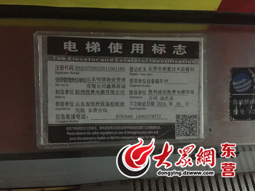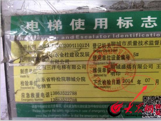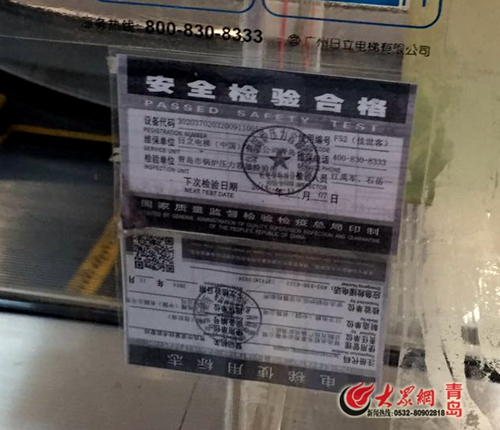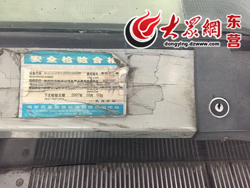 在芝罘區(qū)南大街的振華商廈,記者發(fā)現(xiàn)在商廈東門有一由一樓駛向二樓扶梯的“電梯使用標(biāo)志”顯示的下次檢驗日期為2015年的5月,已過期兩個月,至今未更換,電梯也仍在使用,不時有顧客乘坐。